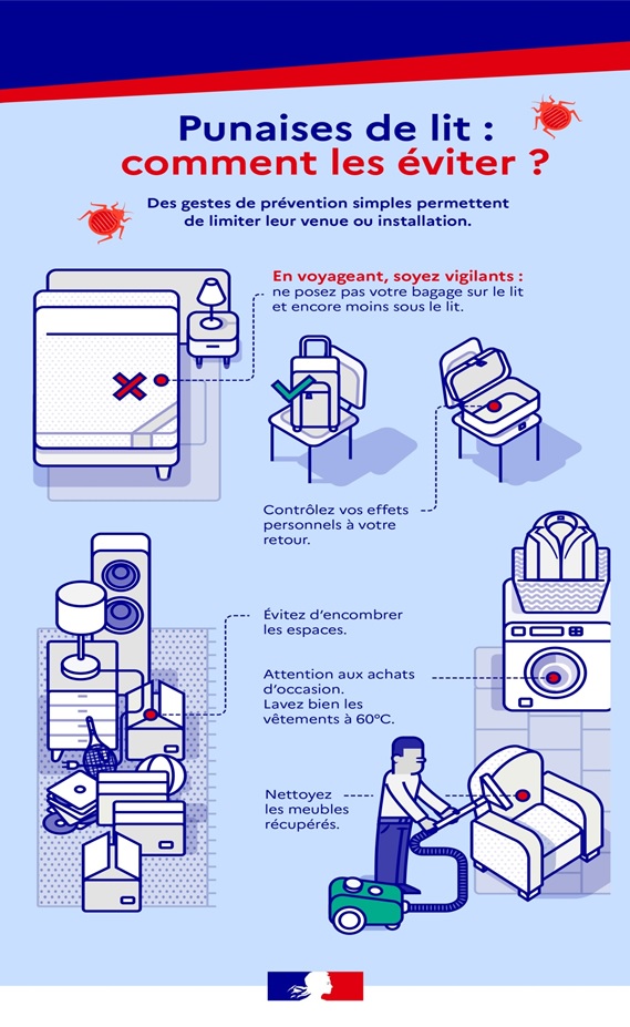 Au retour d'un voyage, bien vérifier qu'il n'y a pas de punaises de lit dans les bagages, laver les vêtements et les articles en tissu à eau très chaude (si possible à 60°C).