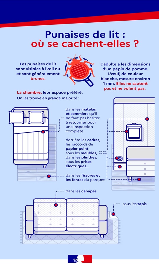 Les punaises de lit sont visibles à l’œil nu (dimensions d'un pépin de pomme) et sont généralement brunes. Elles ne sautent pas et ne volent pas, elles se nourrissent de sang et peuvent survivre plusieurs mois sans se nourrir. Elles peuvent piquer jusqu'à 90 fois en une seule nuit et leurs développement est rapide, il est donc important d'intervenir au plus vite.